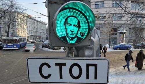 2012年2月13日,俄羅斯莫斯科街頭現“普京版交通信號燈”,支持者希望群眾為普京(jīng)“亮起綠燈”。