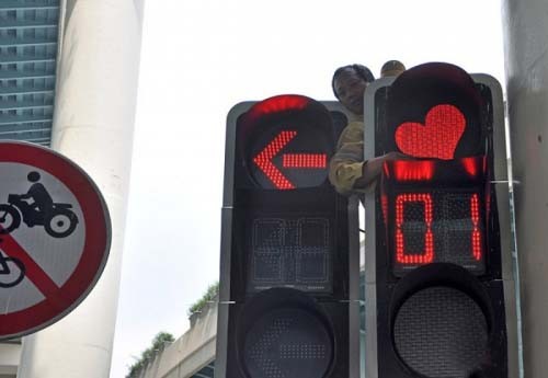 2011年5月9日,位於上海延安西路中(zhōng)山西路路口的某個紅燈呈現愛(ài)心形(xíng)狀,這(zhè)個個性信號燈(dēng)受到網友熱捧(pěng)。9日中午,相關施工人員將蒙在(zài)紅燈上的愛心蒙(méng)版摘取下來。